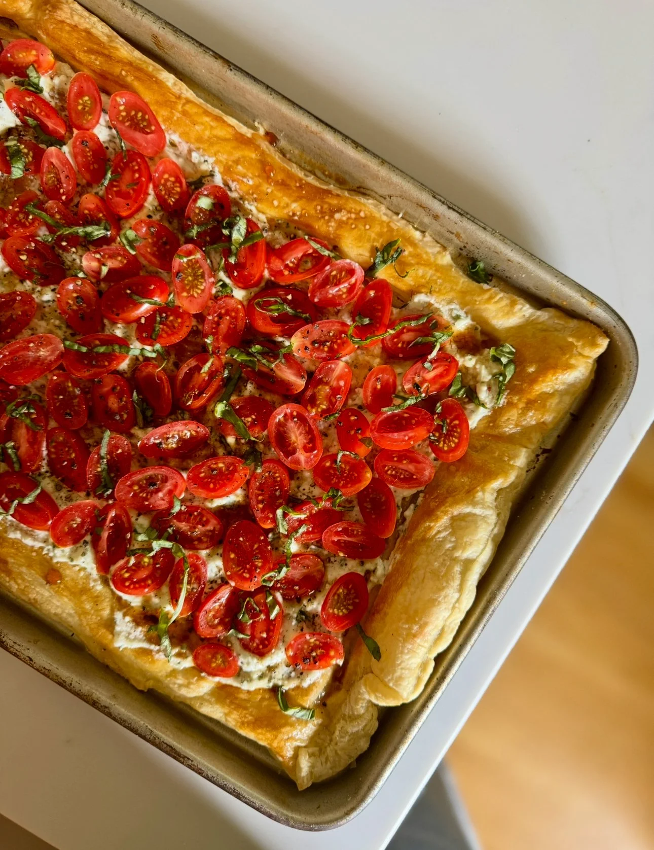 Flaky puff pastry, a creamy herbed feta spread, juicy cherry tomatoes, and a drizzle of balsamic glaze. This tart looks impressive but comes together with minimal effort.