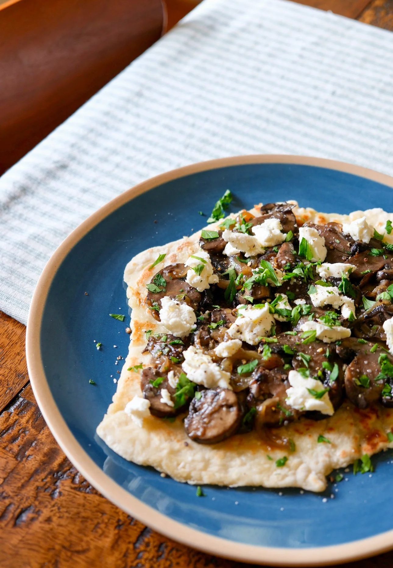 - Spoon the caramelized onion and mushroom mixture over the warm flatbreads. Crumble goat cheese on top and finish with chopped fresh parsley. Slice and serve warm.