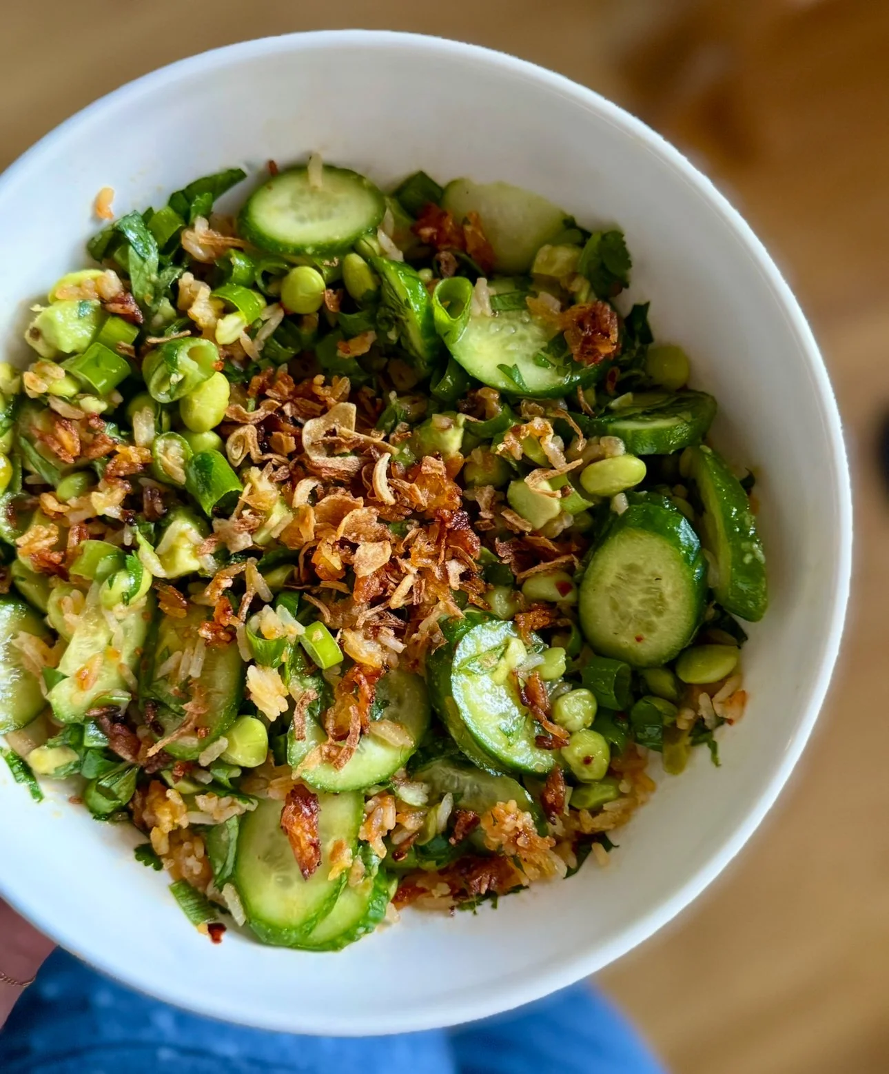 - In a medium bowl, combine cucumbers, edamame, avocado, green onions, cilantro, and mint.