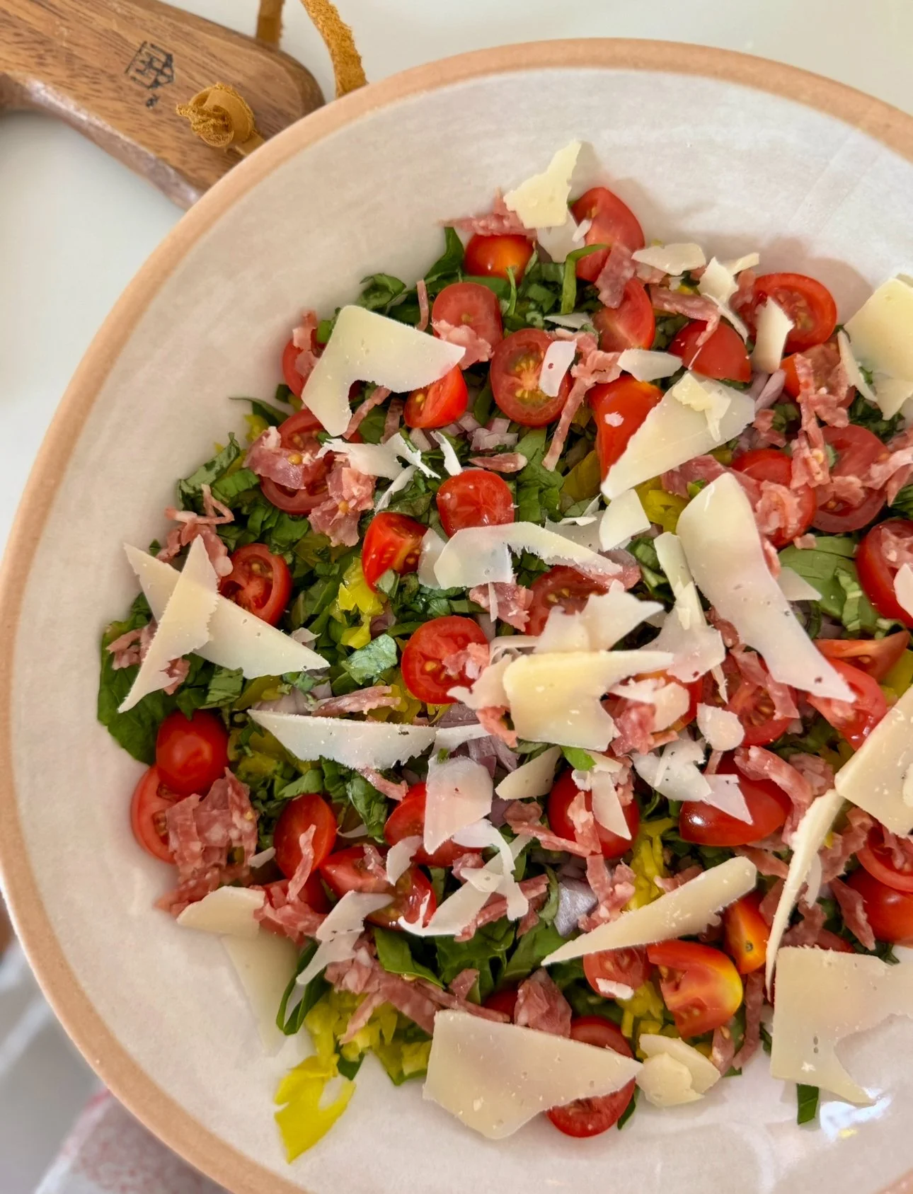 - In a large bowl, combine chopped romaine, red onion, pepperoncini, tomatoes, basil, salami, and shaved Parmesan.