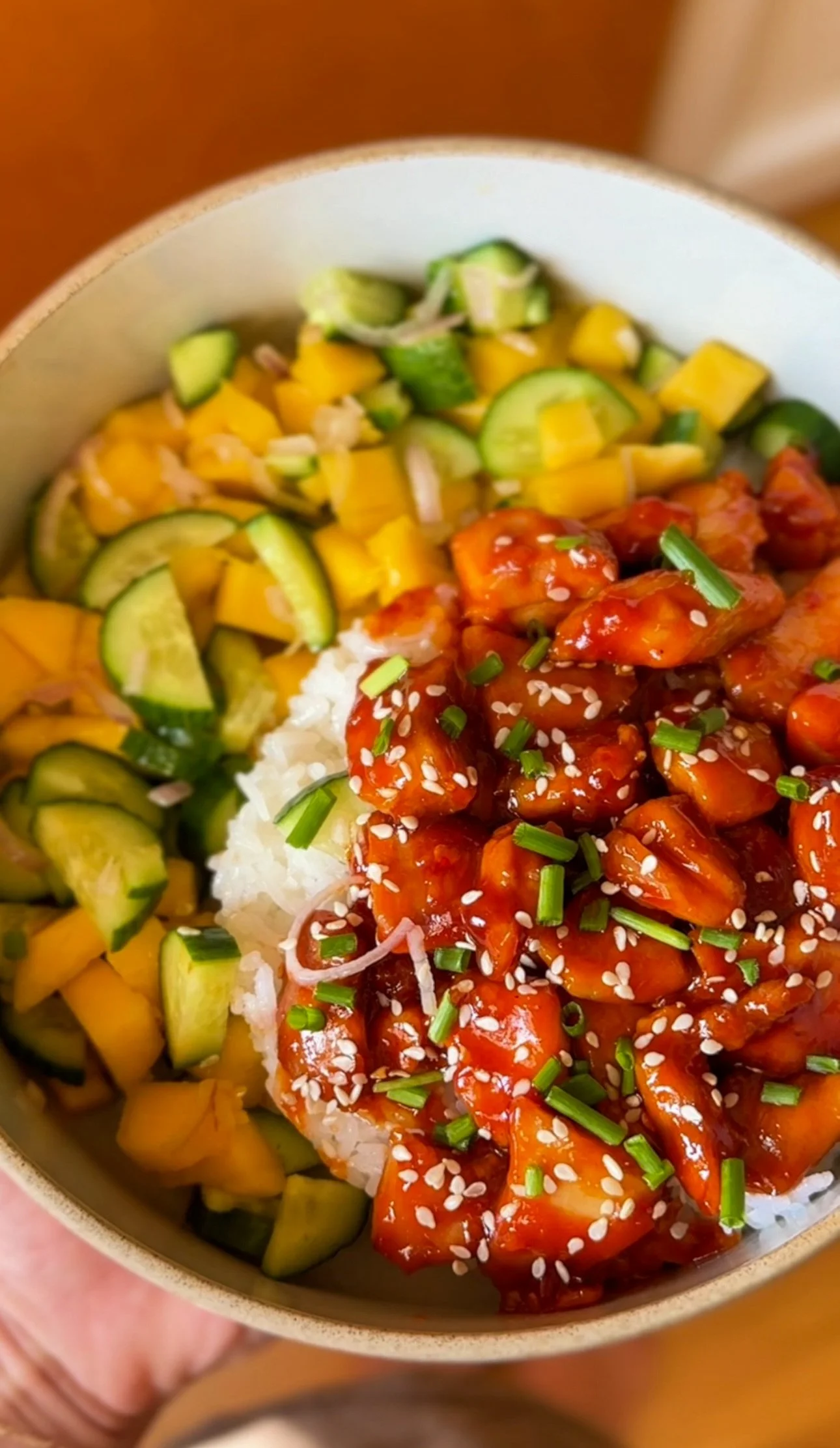 I love this bowl because it’s so balanced. The chicken is sticky, spicy, and just a little sweet thanks to a bold marinade of gochujang, ponzu, honey, and Calabrian chili. It gets cooked until caramelized and glossy, then piled over fluffy white rice. The whole thing comes alive with a chilled mango-cucumber salsa that cools the heat and adds a fresh, juicy crunch.